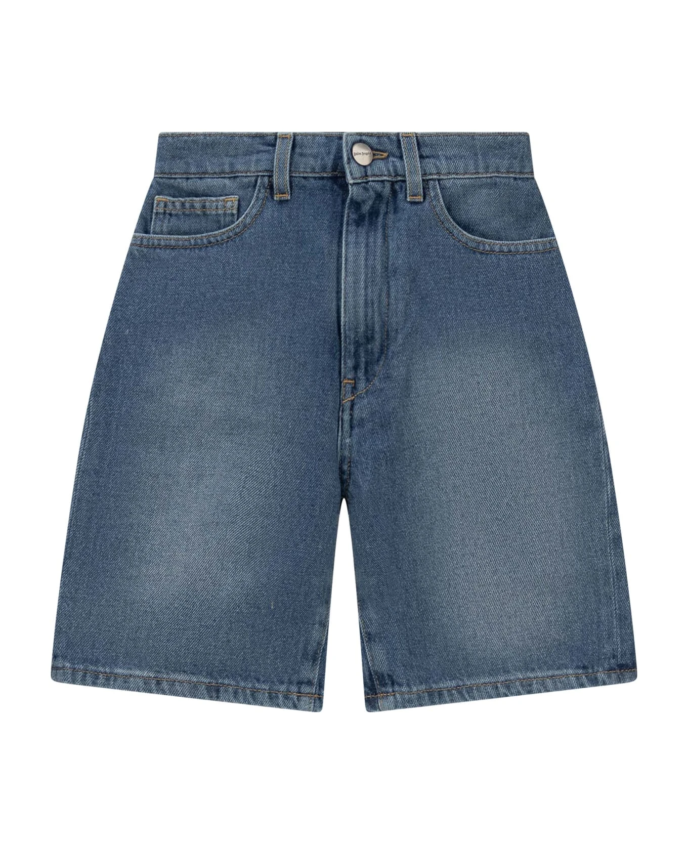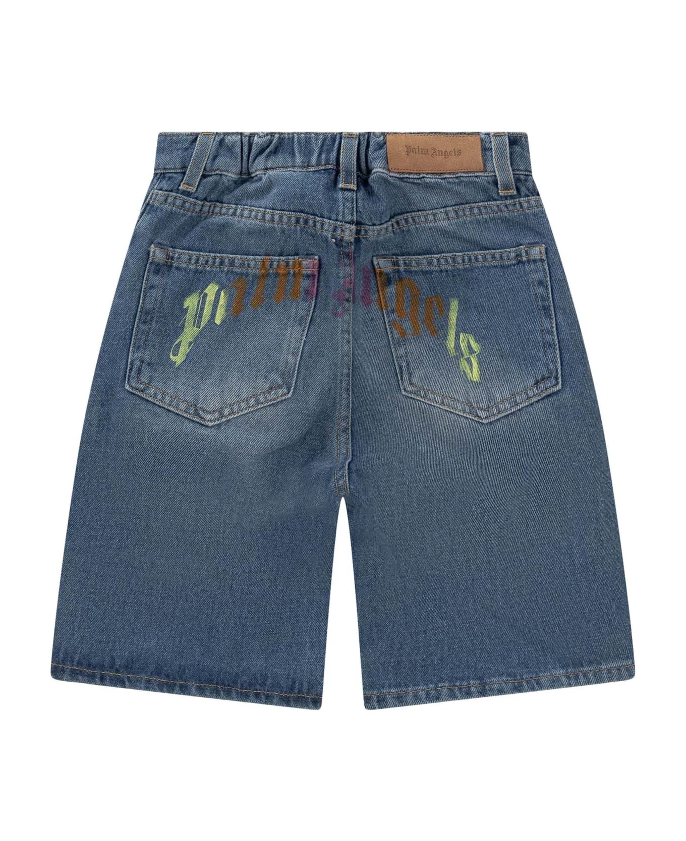 Blue denim med shorts. Zip and button closure. Belt loops. 5 pockets. Rainbow logo on the back.