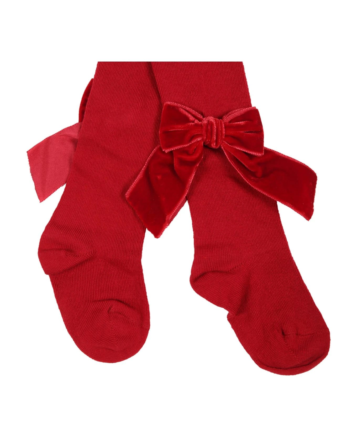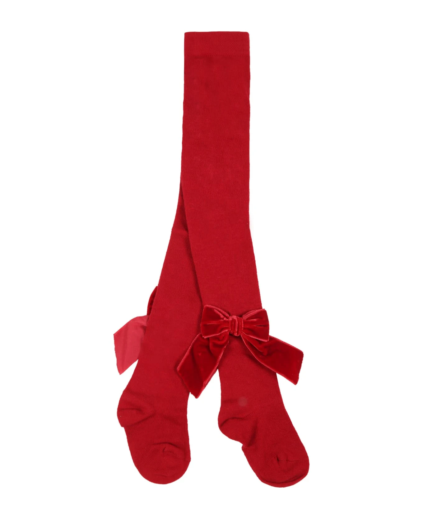 Red tights with elasticated waist, embellished with velvet bows on the front.