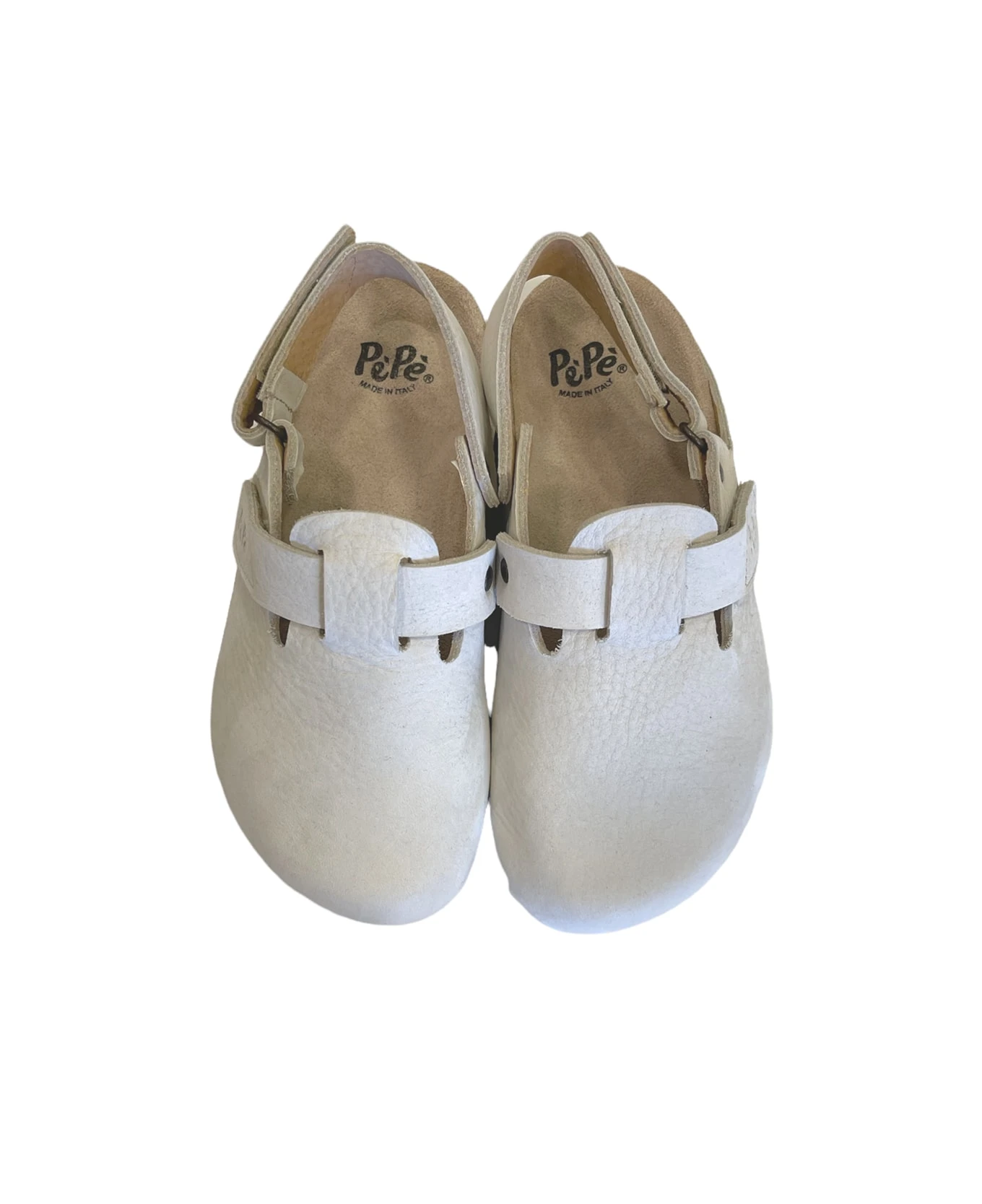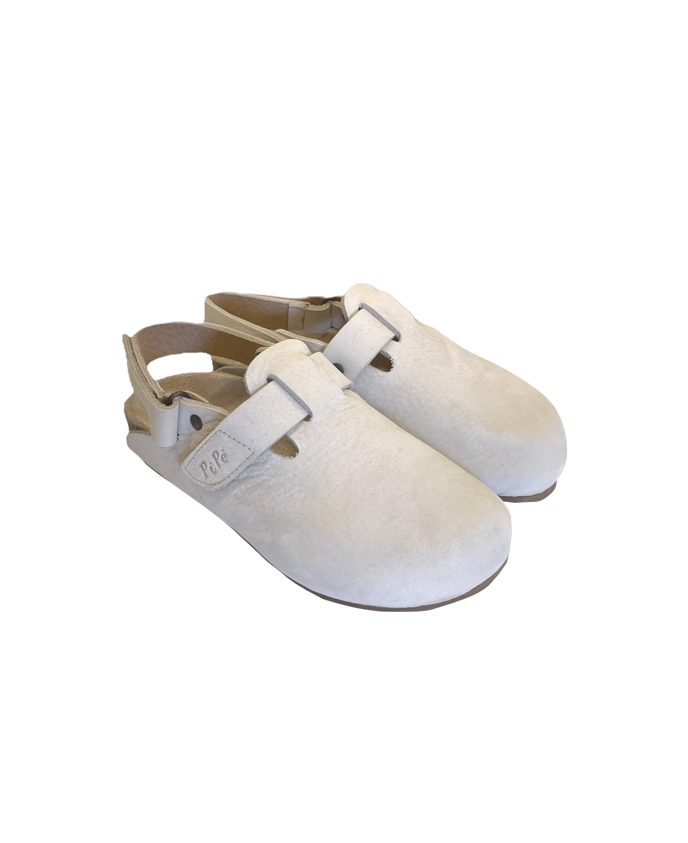 Round toe, rear hook and loop closure, leather insole with logo and flat sole.