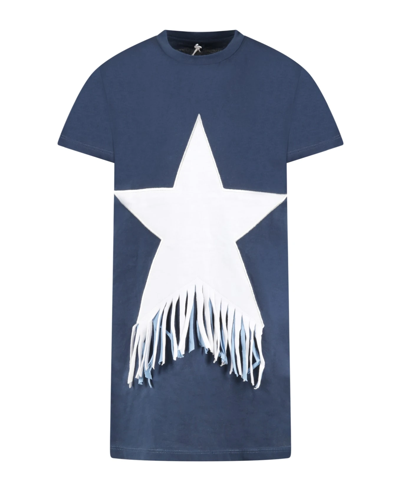 Blue dress in sustainable cotton, with short sleeves, crew neck and ribbed hem. It is embellished with white star with fringes embroided on the front.