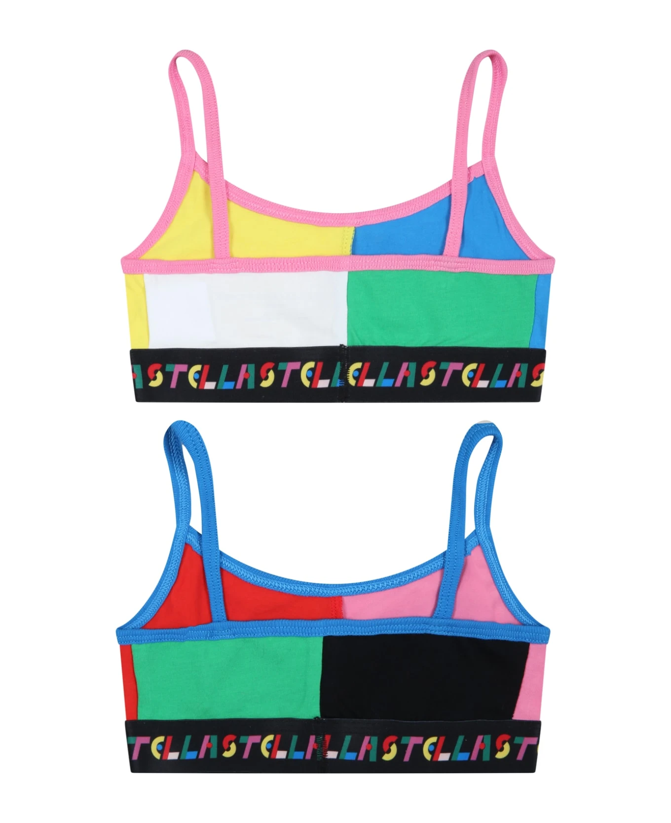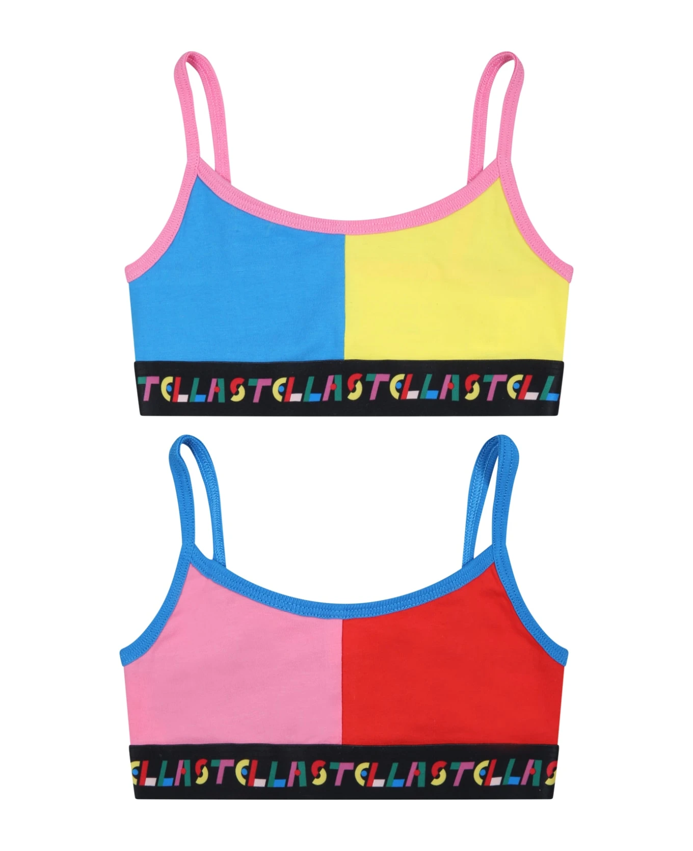 Multicolor set composed of two tops in sustainable cotton, with shoulder pads and elasticated band. They are embellished with logo on the bottom.