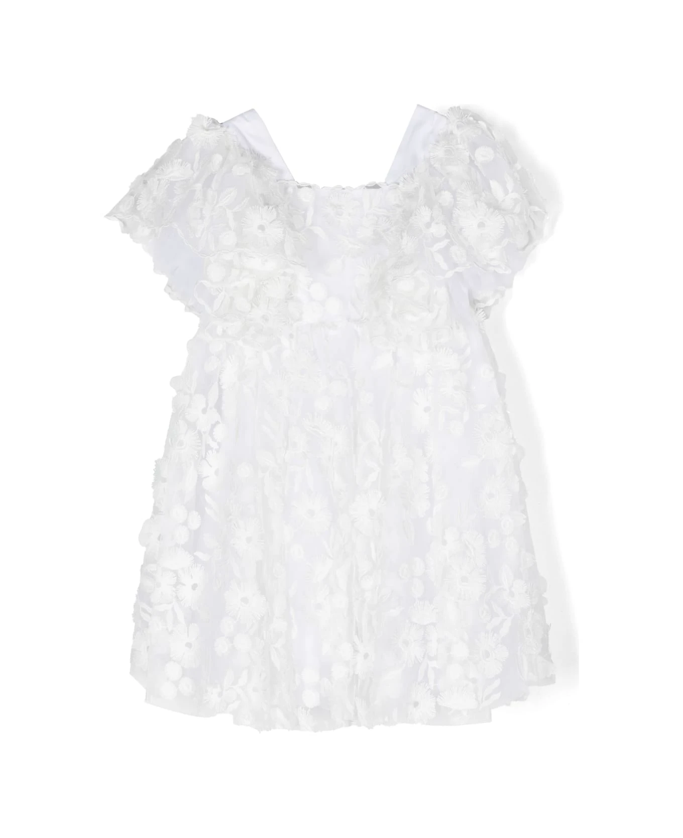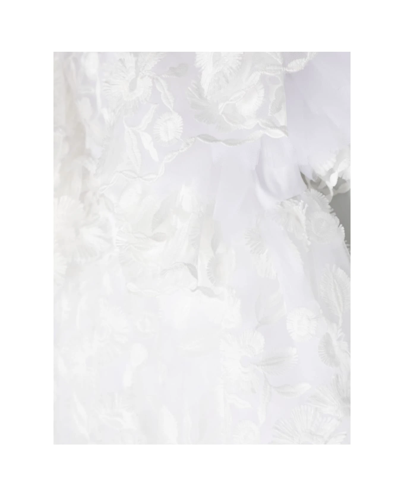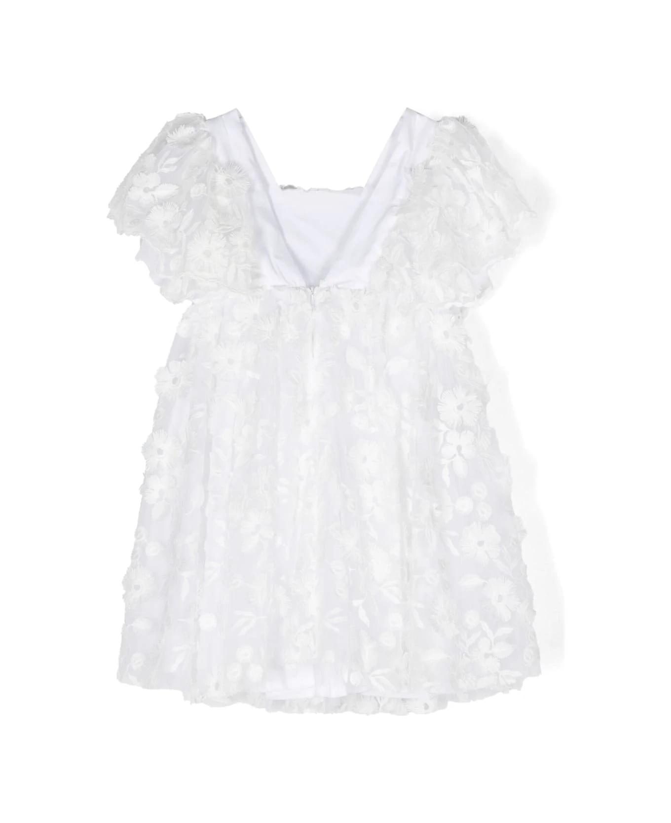 Bianco, ricamo con fiori, dettaglio in pizzo a fiori, pannelli in tulle, scollo a V sulla schiena, chiusura posteriore con zip nascosta, maniche corte, orlo svasato e fodera in cotone.