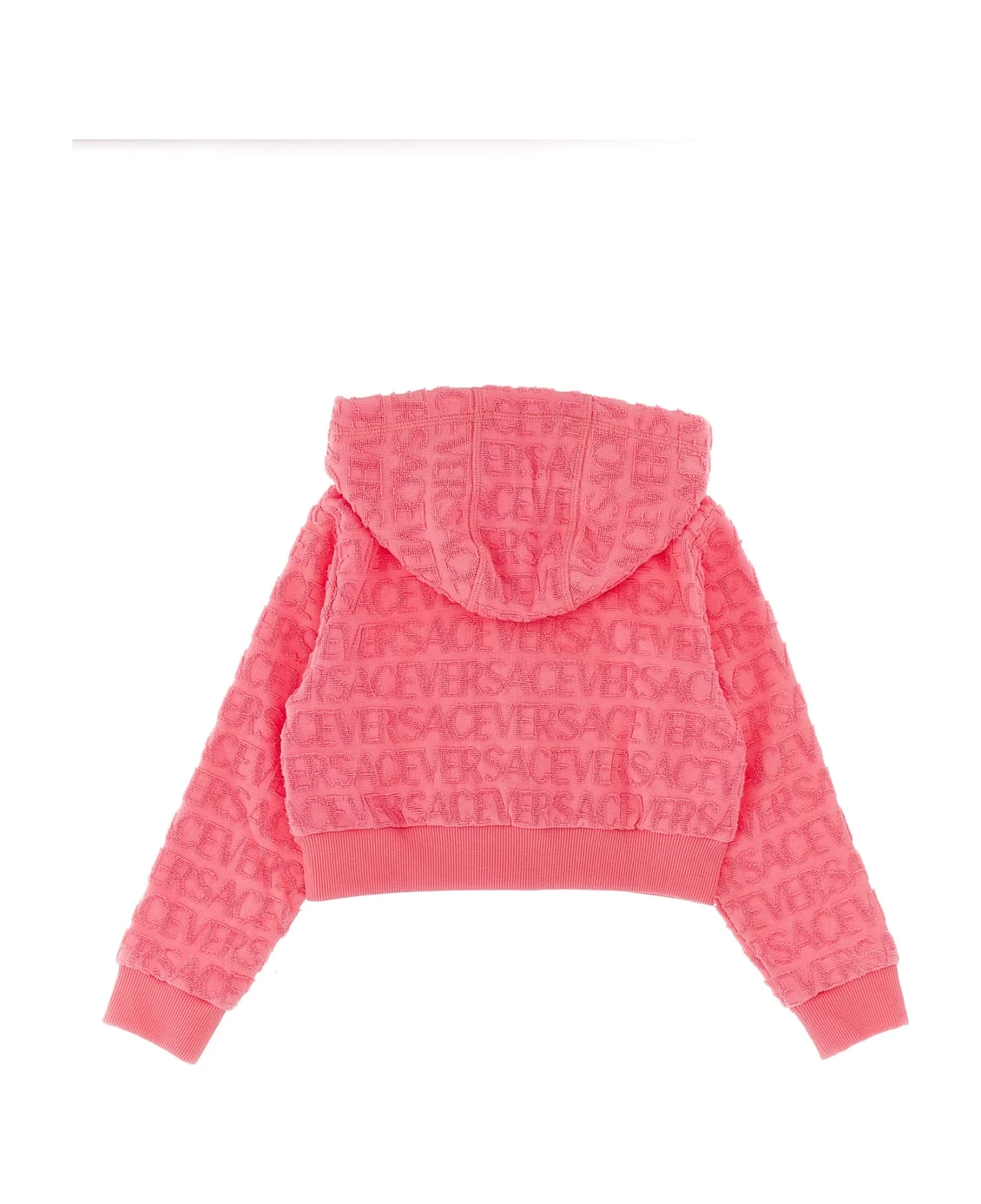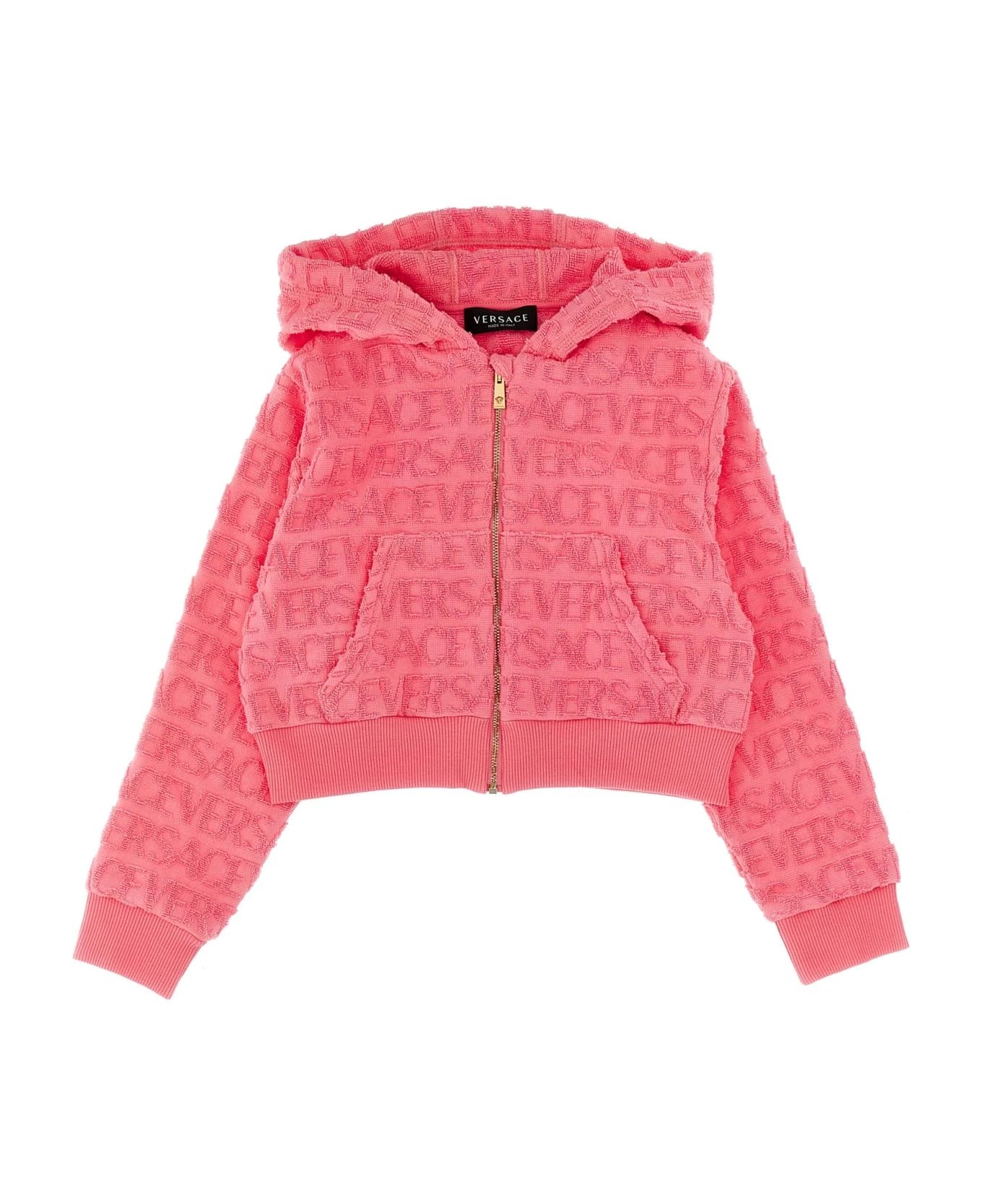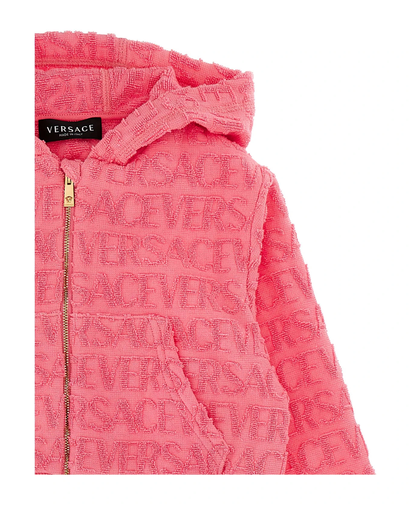 La Vacanza cotton terry cloth capsule hoodie with ‘Versace Allover’ pattern, a zip closure, pockets, and long cuffed sleeves.