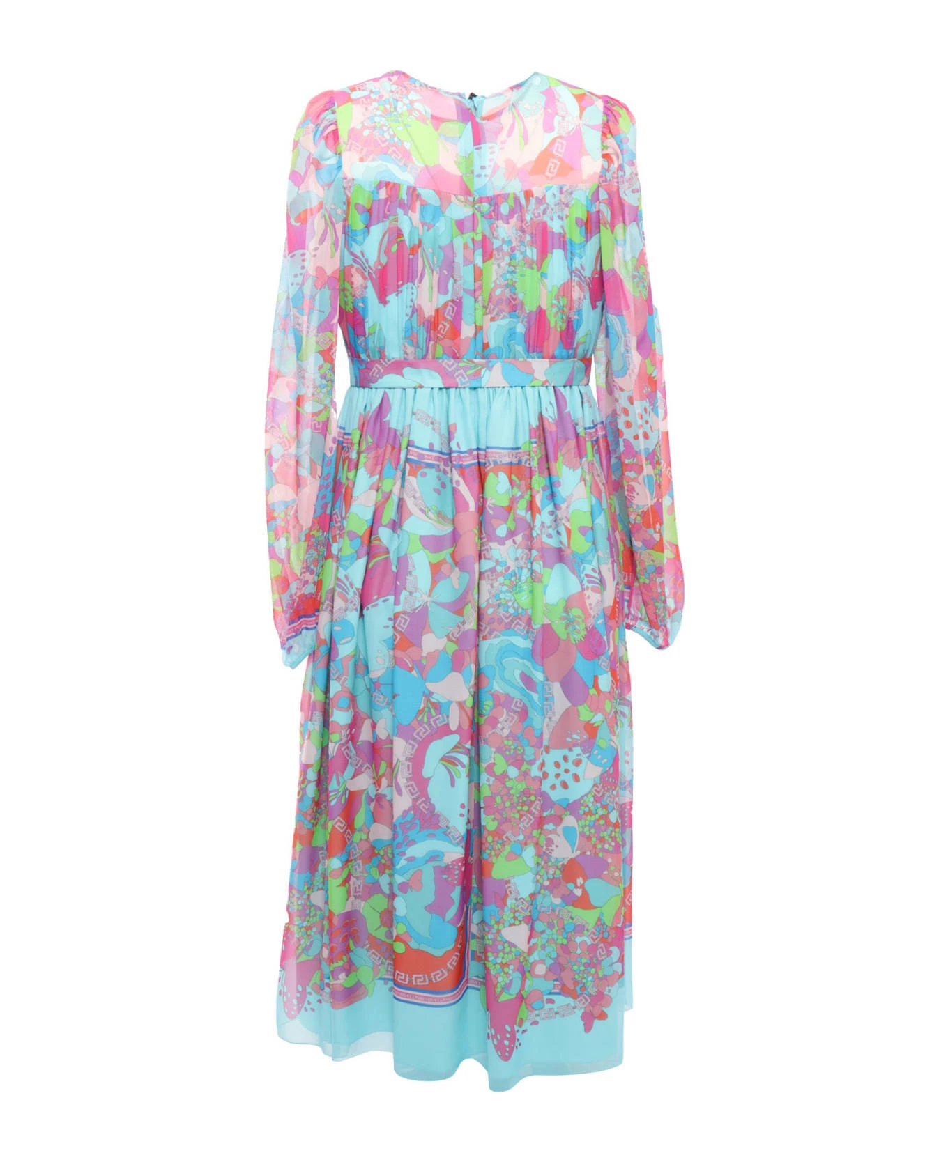 Georgette dress, long sleeves, floral motif print with all over Greca, zip fastening on the back