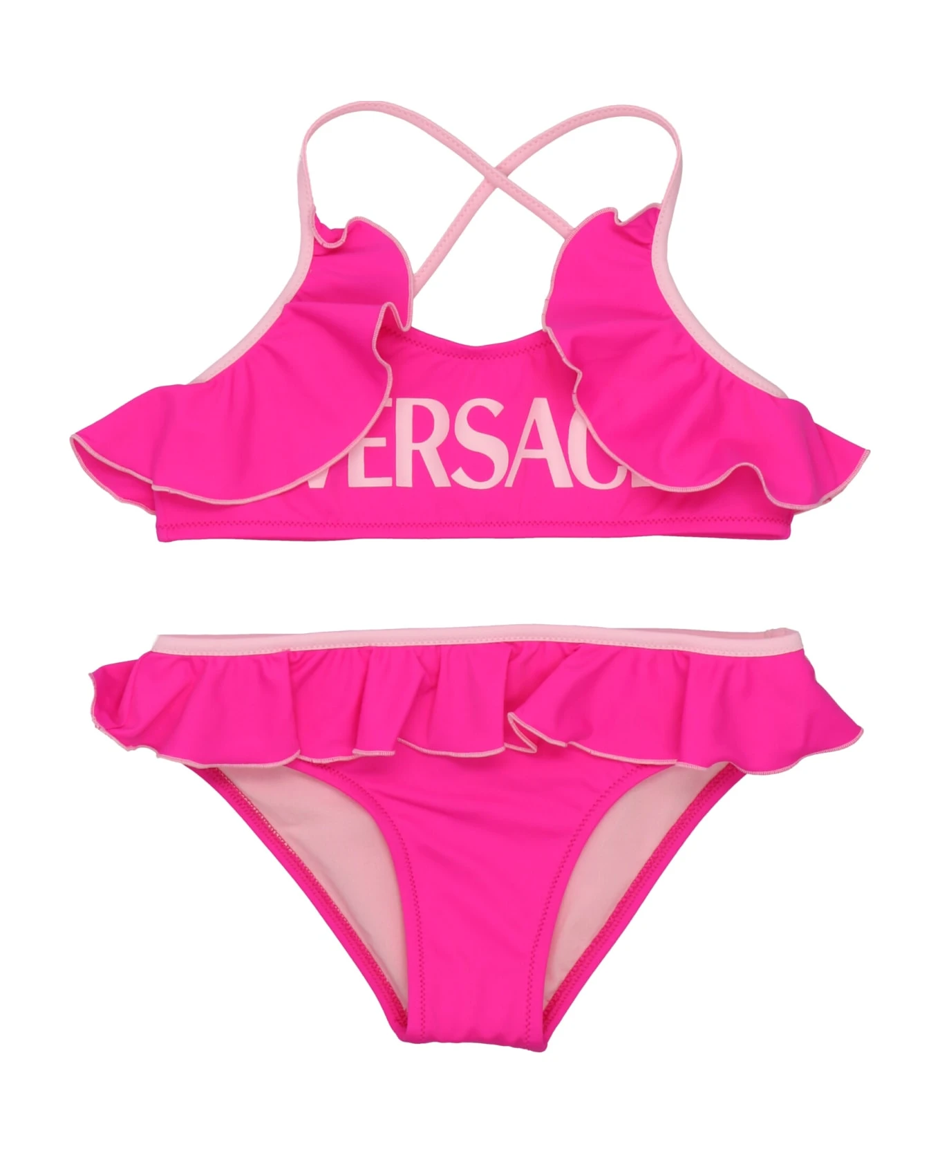 Stretch fabric bikini made up of top with logo print, rupches, thin straps, hook at the back and flounced briefs.