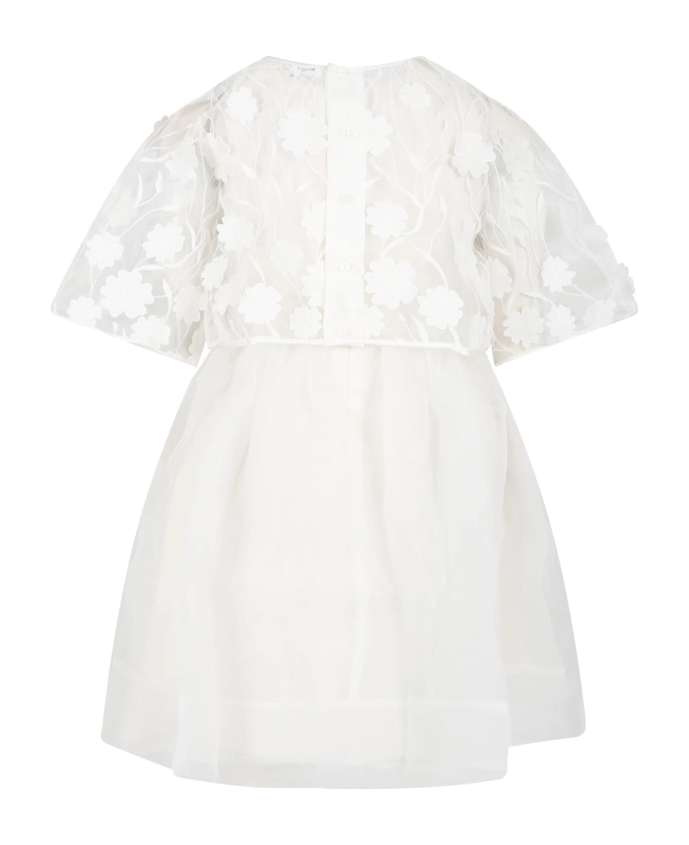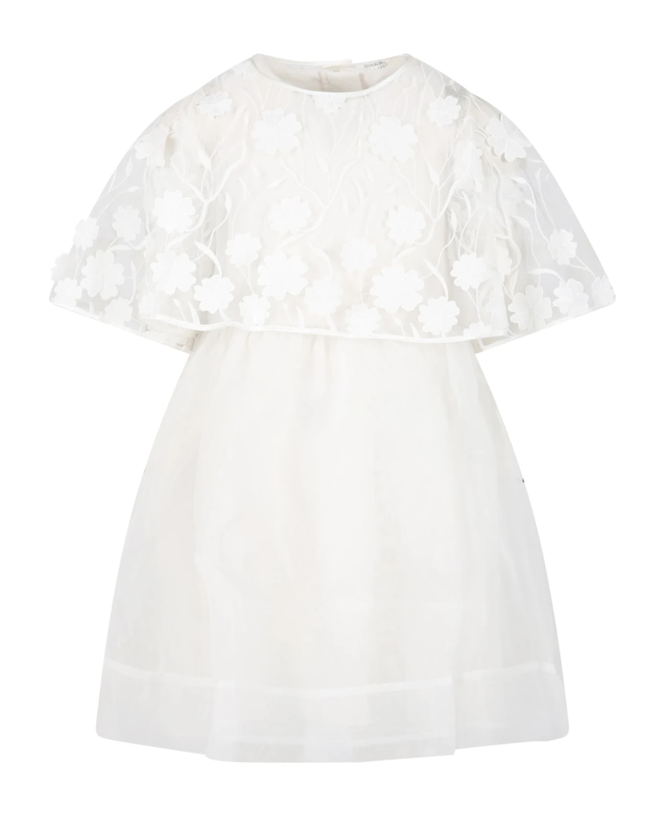 White sleeveless tulle dress, with zip closure on the back. It is made up of a removable lace shrug, with button closure on the back.