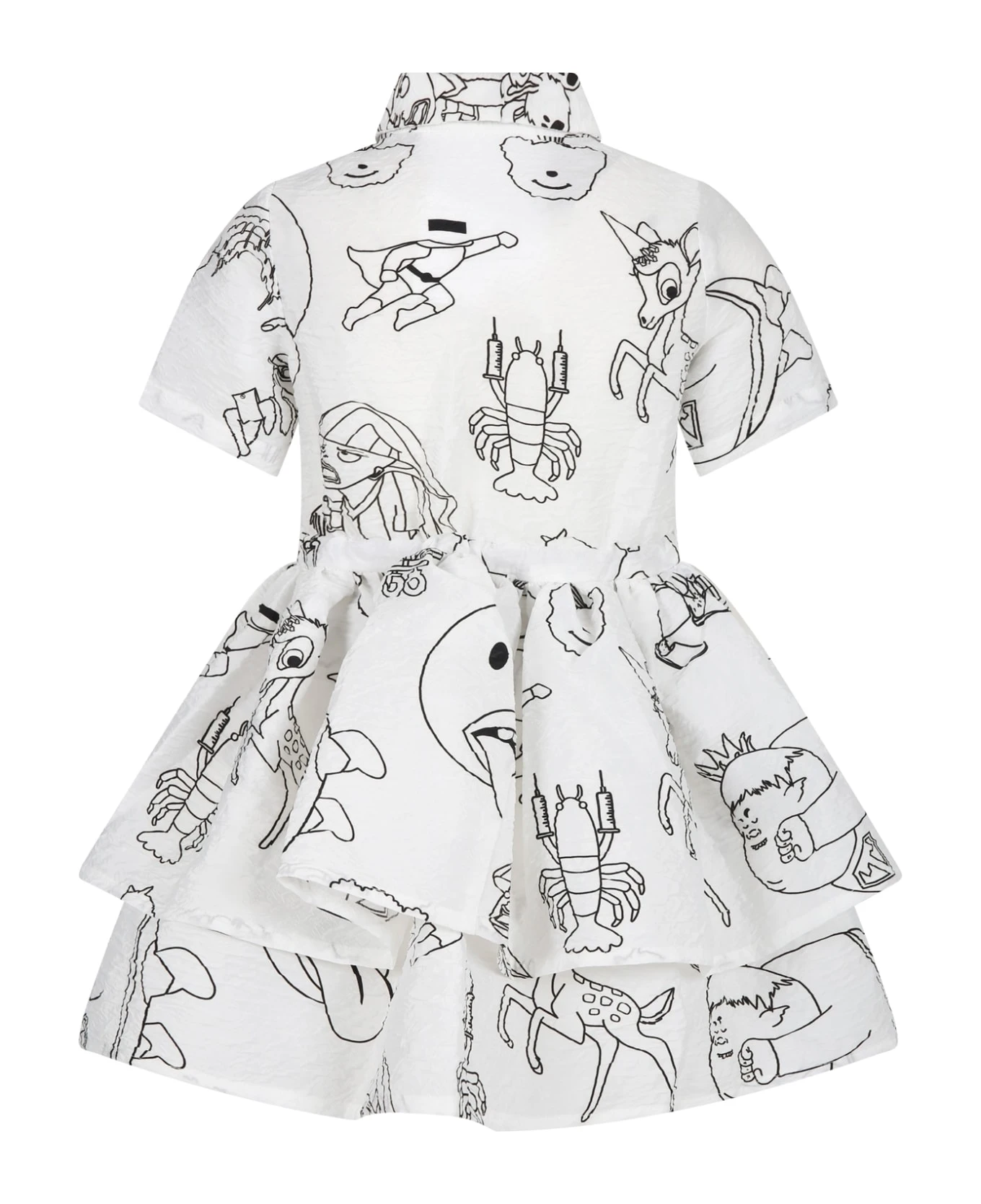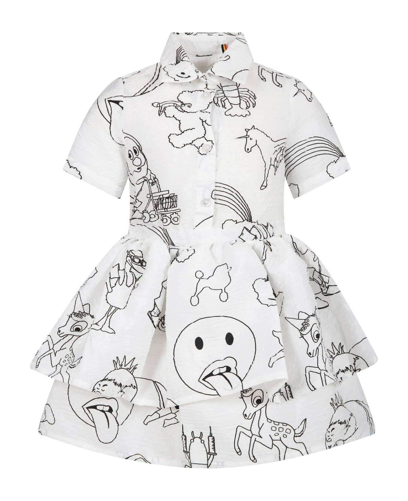 White dress, with short sleeves, classic collar, flounced skirt, elastic waistband and button closure, on the front. It is embellished with all-over prints to be colored with the supplied acrylic colours, not washable.