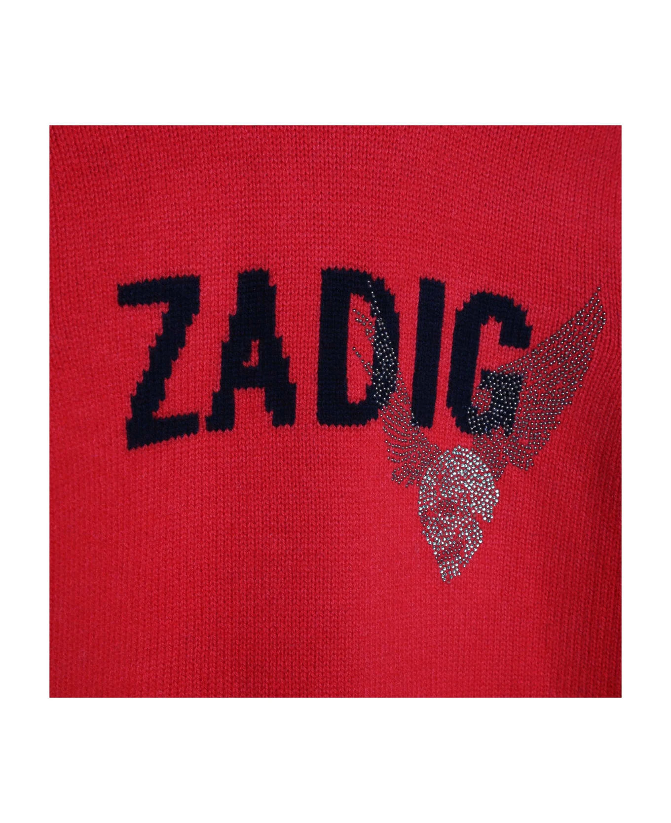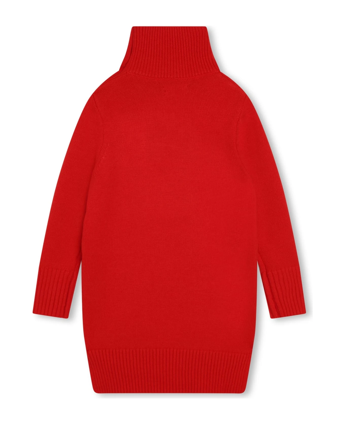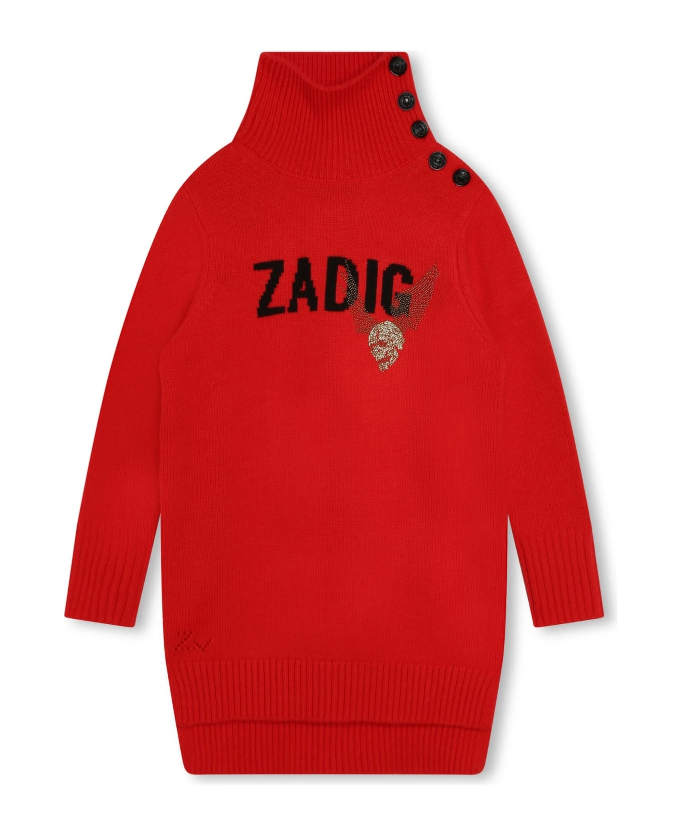 Bright red, knitted design, inlaid logo, rhinestone decoration, high collar, shoulder button placket and long sleeves. Composition